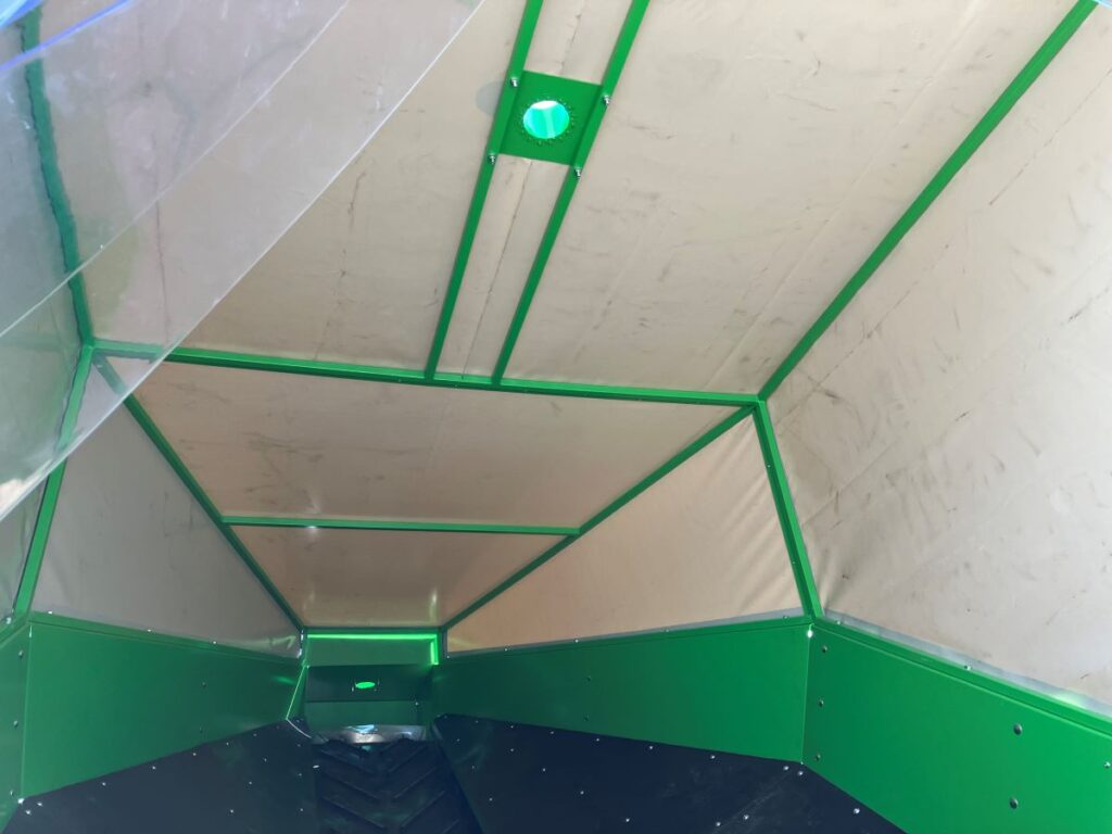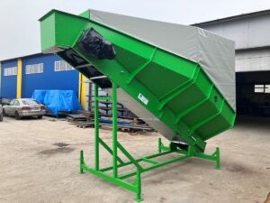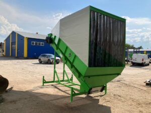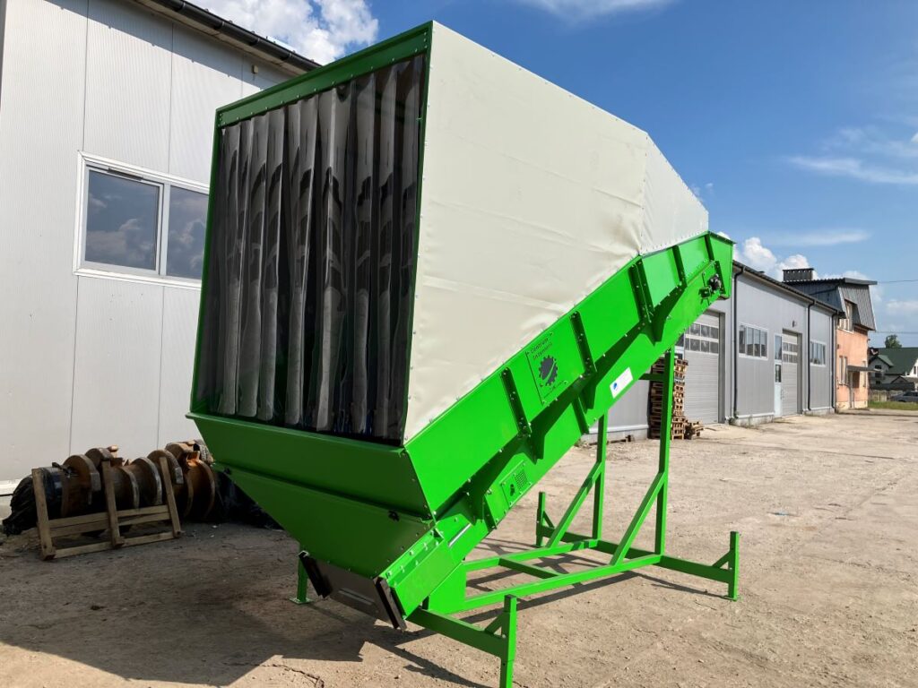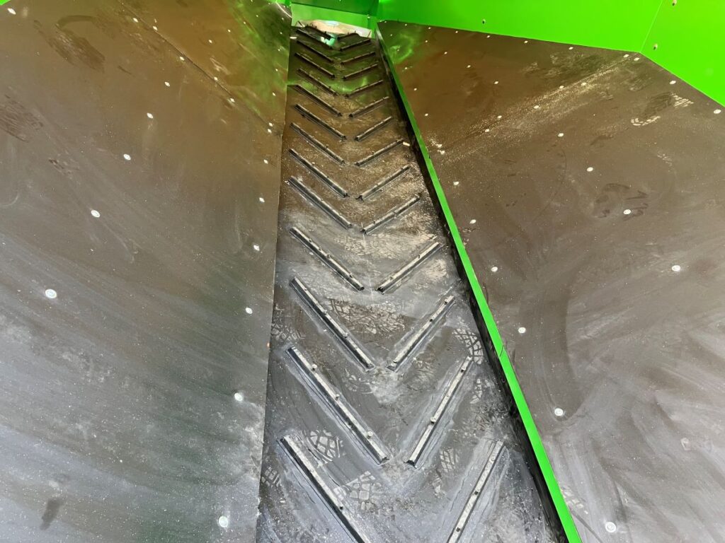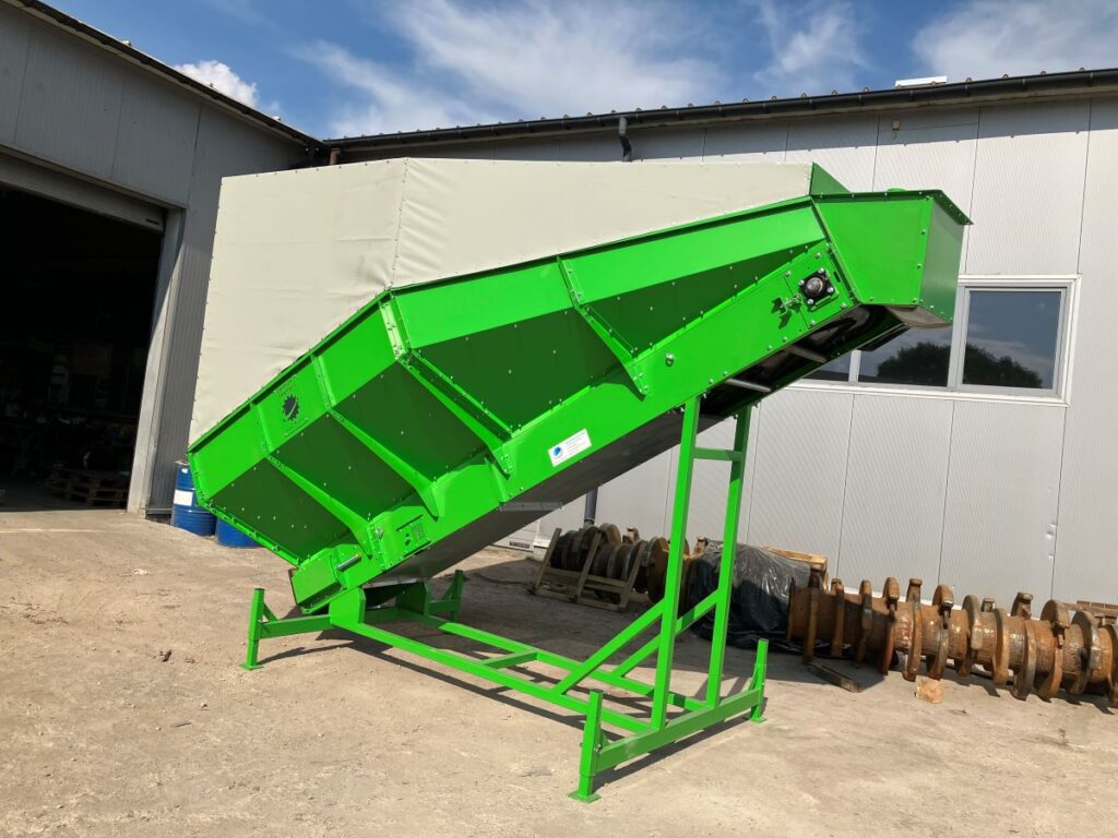 Przenośnik taśmowy wznoszący z dodatkową zabudową zabezpieczającą przed rozprzestrzenianiem się pyłu. Dodatkowo boczne ściany wyłożone gumą w celu zabezpieczenia przed iskrzeniem przy recyklingu baterii